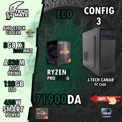 CPU: RYZEN5 PRO 5650G COOLING: AMD FAN STOCK MOTHERBOARD: A520m ASUS PRIME RAM: 8GB 2666mhz ROM: SSD 128GB PSU: SMART POWER 450W 6PIN CASE: J-TECH CANAR