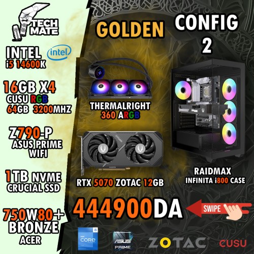 CPU: i5 14600K COOLING: thermelright 360mm BLACK MOTHERBOARD: Z790-P ASUS PRIME WIFI RAM: 64GB(16GBx4) CUSU RGB 3200mhz GPU: RTX 5070 ZOTAC TWINEDGE 12GB ROM: SSD CRUCIAL 1TB NVME PSU: ACER 750W 80+ BRONZ CASE RAIDMAX INFINITA i800 BLACK