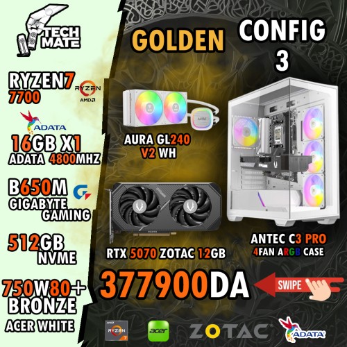 CPU: RYZEN7 7700 COOLING: Watercooling 240mm AURA WHITE RAM: 16GB ADATA 4800MHZ MOTHERBOARD: B650M GIGABYTE GAMING WIFI WHITE GPU:RTX 5070 ZOTAC TWINEDGE 12GB ROM: SSD 512GB NVME PSU: ACER 750W 80+ BRONZ WHITE CASE: ANTEC C3 PRO 4 FAN ARGB
