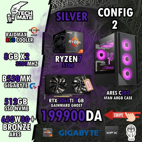 CPU: RYZEN 7 5700 COOLING: RAIDMAX AC1204KP RGB MOTHERBOARD: B550MK GIGABYTE RAM: 8GBX2 3200MHZ GPU: RTX 3060Ti gainward ghost ROM: 512GB NVME PSU: ARES 650W 80+ BRONZ CASE: ARES C202 4 FAN ARGB