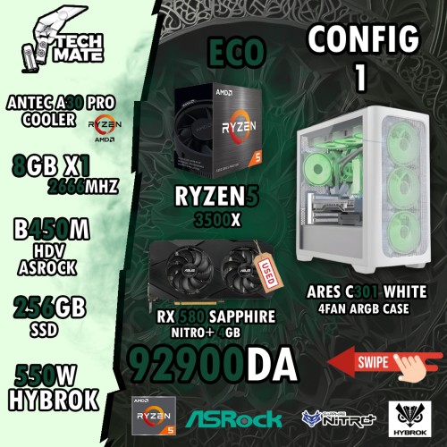CPU: R5 3500X COOLING: ANTEC A30 PRO MOTHERBOARD: B450m asrock hdv RAM: 8GB X1 2666mhz GPU: RX 580 sapphire nitro+ 4GB ROM: SSD 256gb PSU: 550W hybrok CASE: ARES C301 WHITE 4 FAN ARGB
